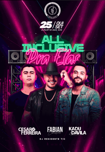 Evento ALL INCLUSIVE PRA ELAS, com atrações de CESAR FERREIRA, FABIAN CARVALHO e KADU DAVILA. Uma noite de muita música e animação!