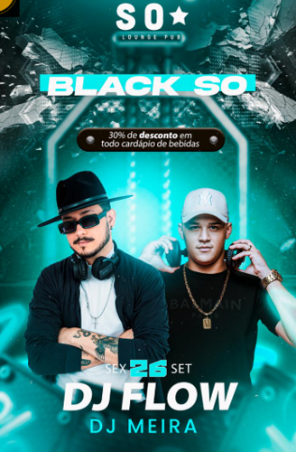 Evento BLACK SO na casa, com apresentações dos DJs FLOW e MEIRA. Venha curtir uma noite de muita música e animação!