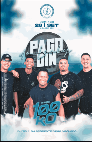 Evento PAGODIN na casa Looby, com atrações do GRUPO 100KO e DJs TIC e RESIDENTE DIEGO MACHADO. Festa de domingo a partir das 23h para começar a semana com energia!