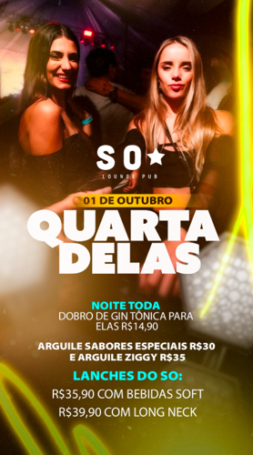 Noite especial com dobro de Gin Tônica para elas por R$14,90. Arguile com sabores especiais a R$30 e Arguile Ziggy a R$35. Lanches do SO: R$35,90 com bebidas soft ou R$39,90 com long neck.