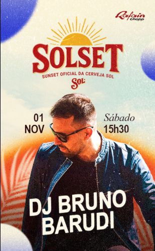 SOLSET oficial da cerveja sol com DJ BRUNO BARUDI. Evento oficial da cerveja Sol no estabelecimento rafain chopp. Venha curtir um pôr do sol com boa música e cerveja gelada!